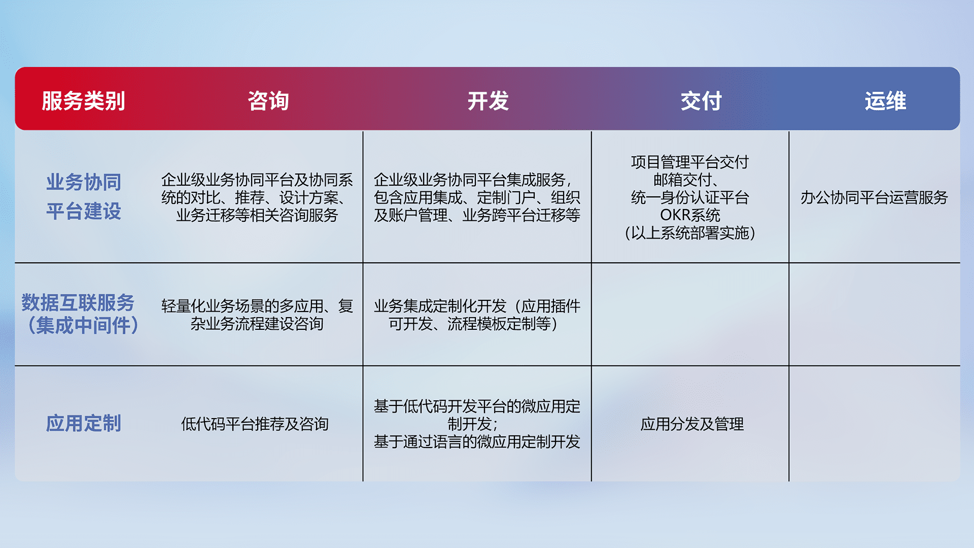 针对钉钉、、企微、、IDaas等平台级产品提供产品的规划、、、、方案、、交付、、定制化开发等服务,,实现如统一协同办公、、智能客户服务、、、、混合会议管理、、、智能数据查询、、、等业务场景,,,实现数字化转型。。。。